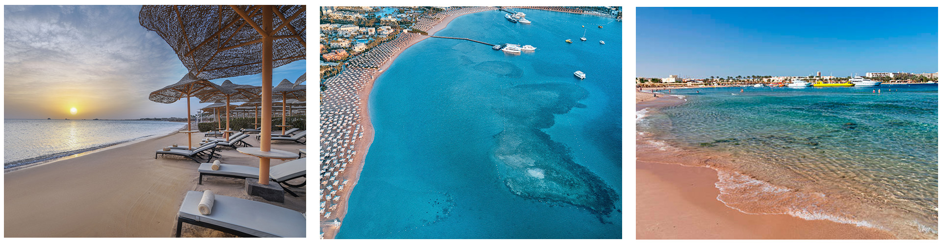 Der er en bred vifte af offentlige strande at vælge imellem, alle let tilgængelige med lokale taxaer for et mindre gebyr. Dog kan der være længere strækninger i Hurghada området, for at komme frem til de forskellige strandområder, så vi anbefaler at man aftaler en fast pris inden man tager turen med Taxi.  Kontakt også gerne vores guider, som gerne hjælper til, med gode råd, fif og vejledning.