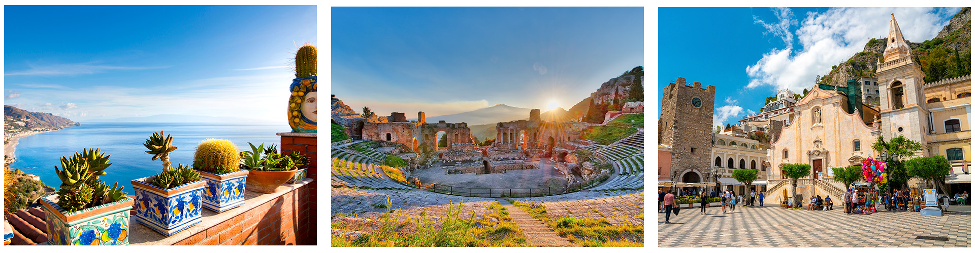 Amisols rejsemål er centreret omkring den frodige by Taormina, der ligger sig op til bjergsiden. Her bugner det med duftende citrontræer, kunstneriske hoteller og kirker, et gammelt græsk amfiteater, samt restauranter, caféer og butikker af enhver art. Bor du oppe på bakken, tager du svævebanen til stranden, som ligger 200 meter længere nede, hvor der også er fine hoteller og spisesteder at vælge imellem. Umiddelbart nord og syd for Taormina, er der to andre feriesteder, Letojanni og Giardini-Naxos, som er store familiedestinationer.