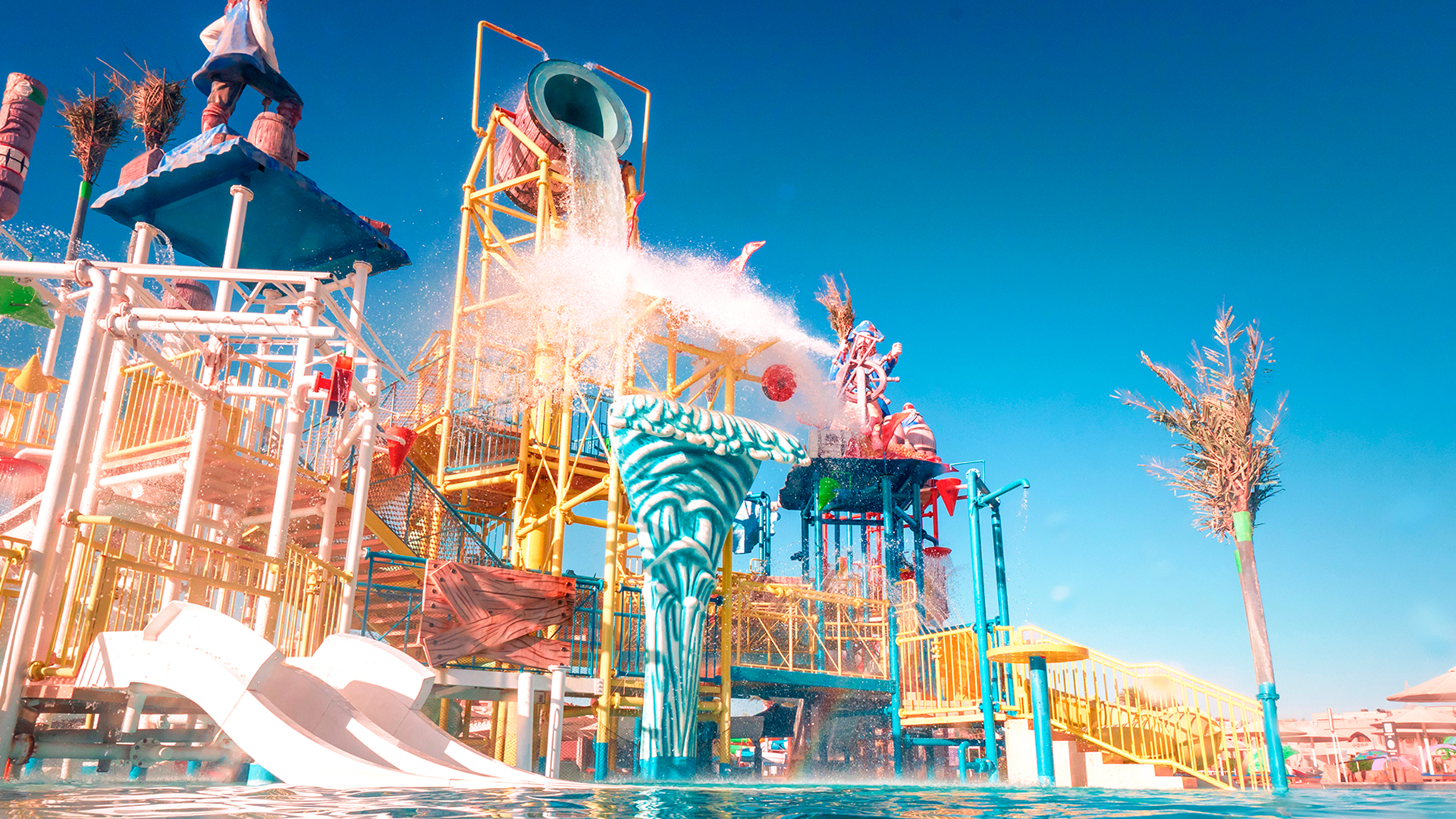 6 pools: 1 bølgebassin, 2 pools for voksne, 1 pool med integreret jacuzzi og 3 børnebassiner med vandrutsjebaner