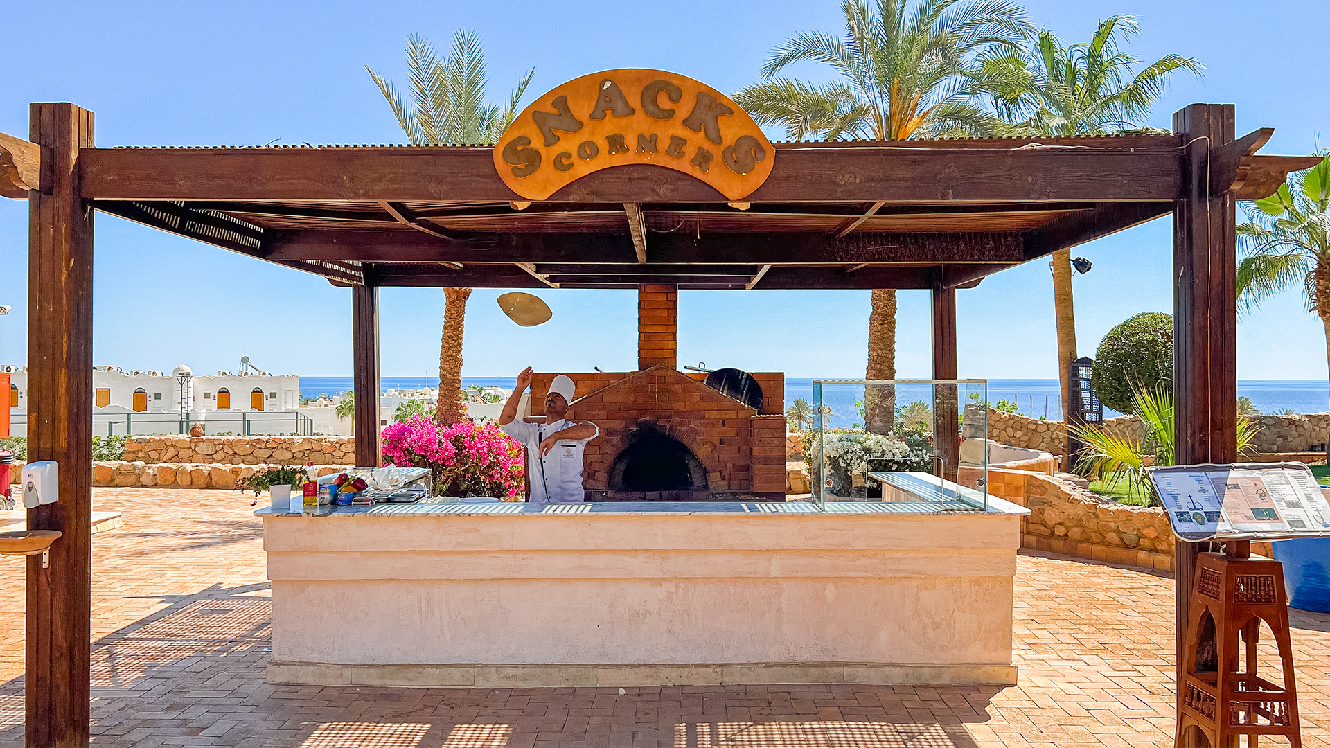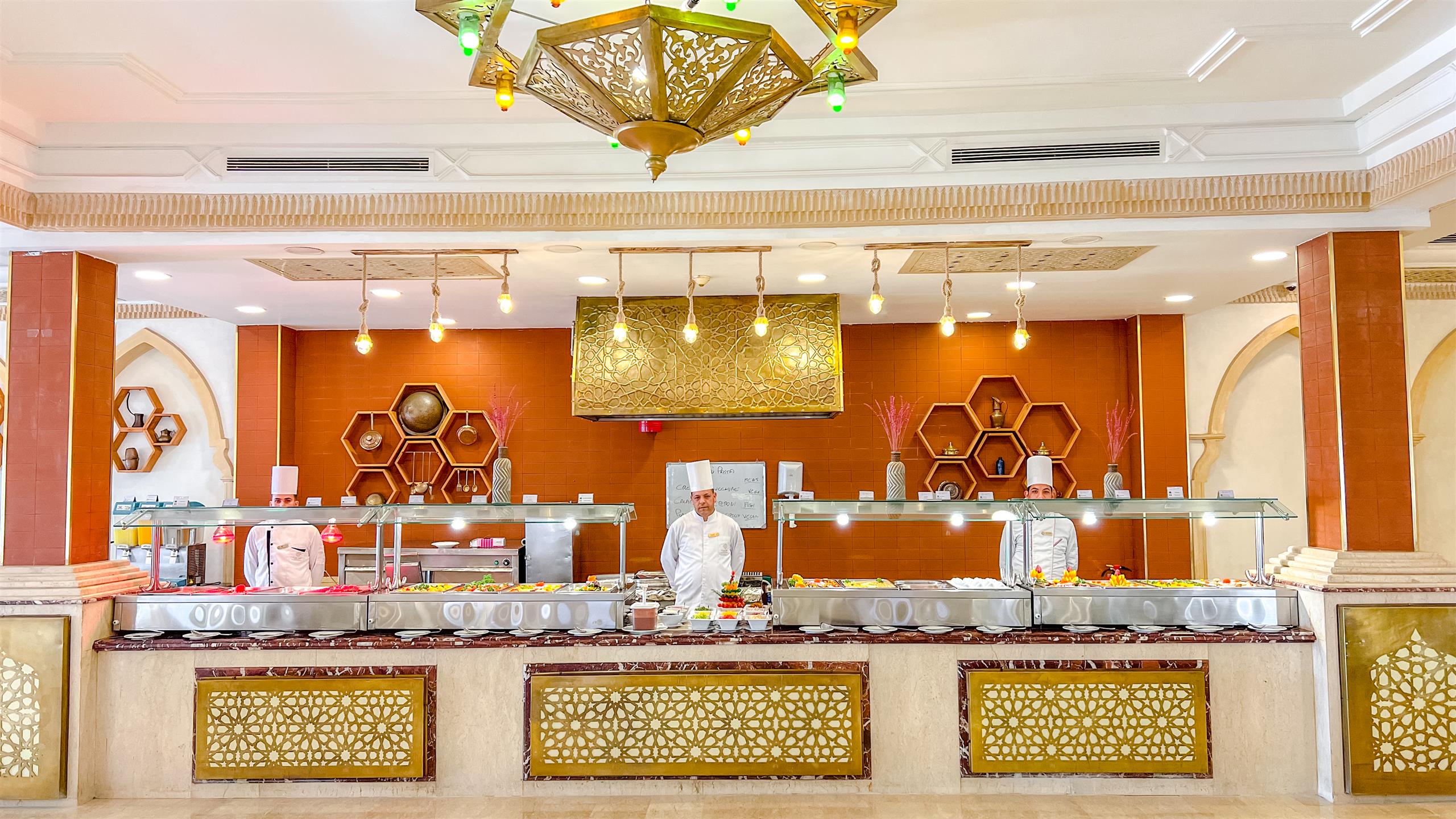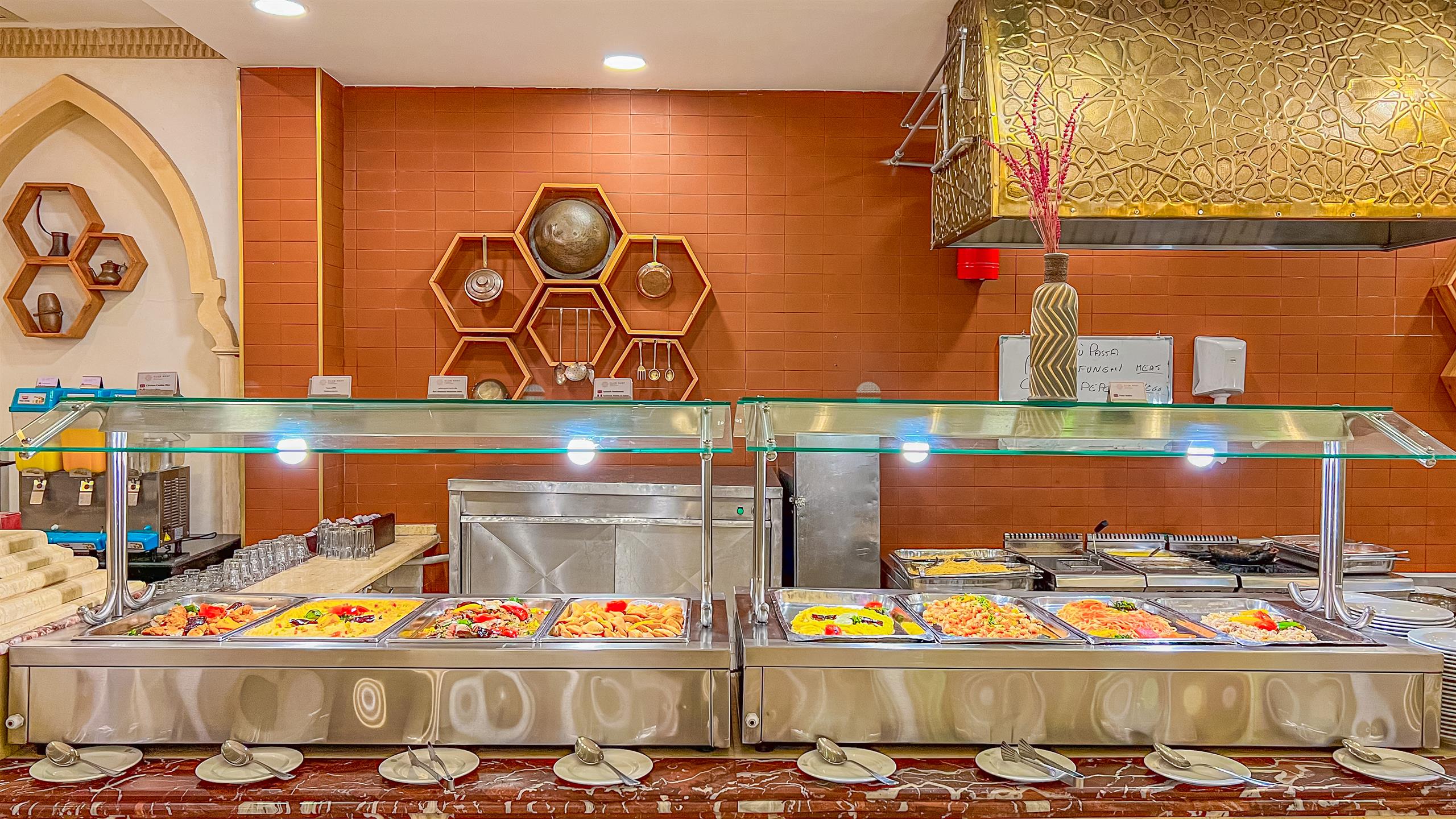 - Fastfood og sandwiches: 12:30 - 17:00 (poolbar). Menuen omfatter hotdogs, kyllingeshawarma, kyllingestrimler med pommes frites og udvalgte drikkevarer.