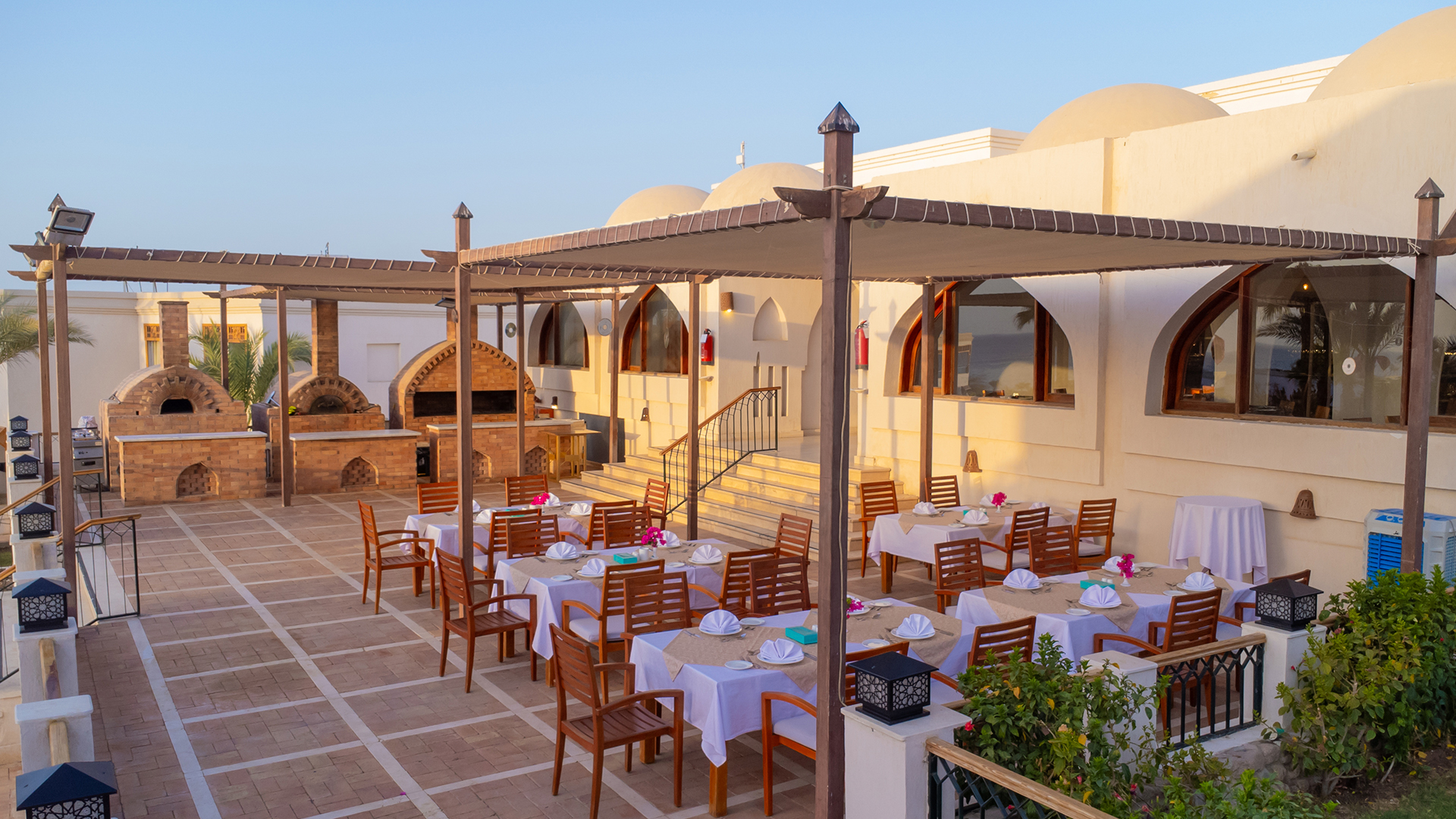 Bordreservation er påkrævet og skal foretages i receptionen mindst en dag i forvejen mellem kl. 10.00 og 13.00. Vælg retter fra en udvalgt menu med fisk og skaldyr, grillede retter, burgere og italiensk pizza.
