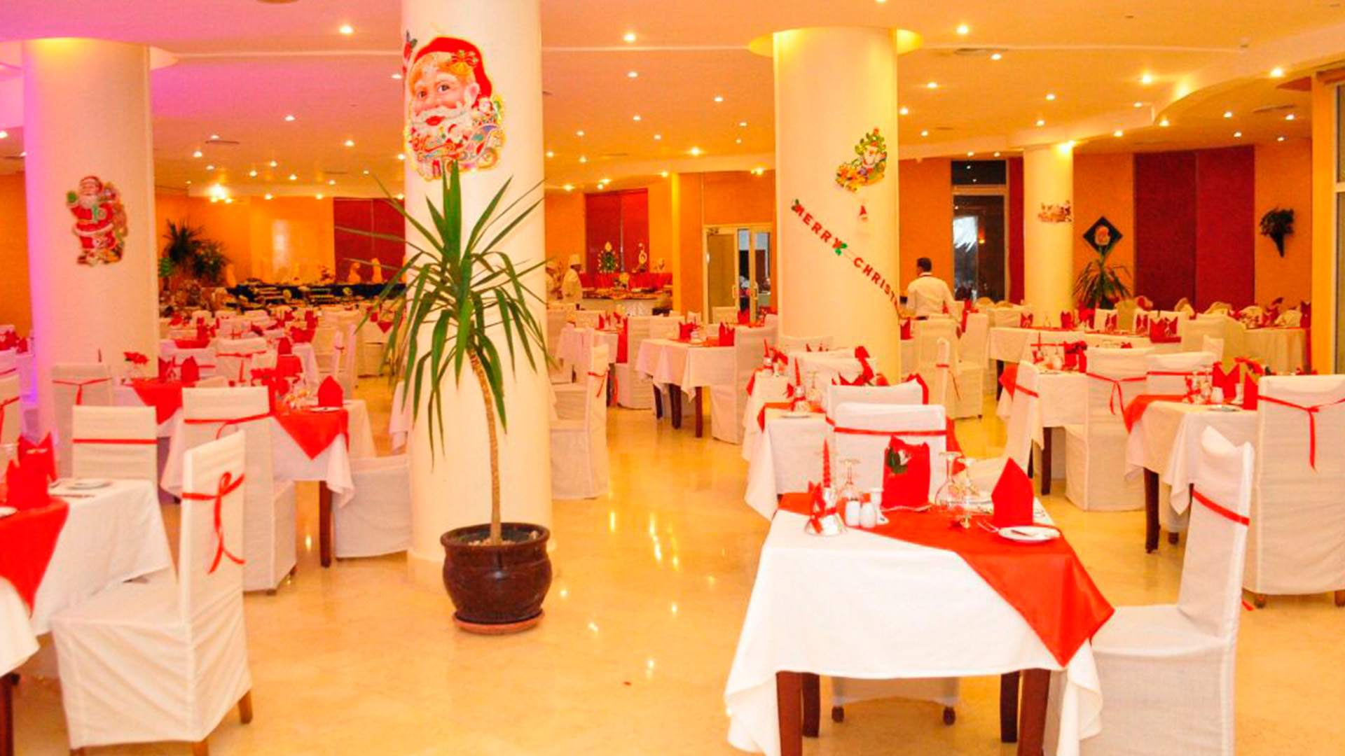 Som standard til all inclusive så nydes morgenmad, frokost og aftensmad i hotellets hovedrestaurant via åben buffet, med faste åbnings og lukketider på hver servering. Snack time er 1 time imellem frokost og aftensmad ved poolbar.
