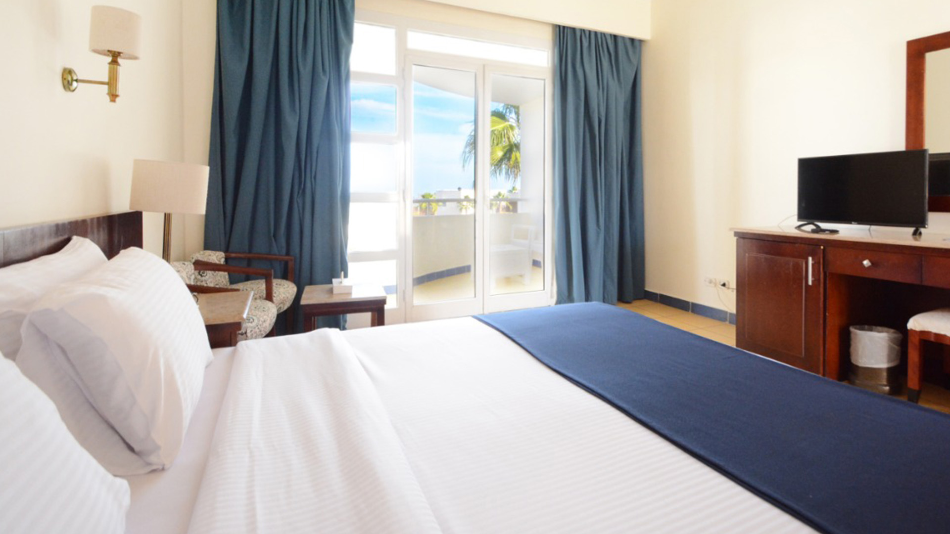 På stranden er der liggestole og parasoller (mad og drikkevarer er ikke inkluderet, men kan købes i strandbaren