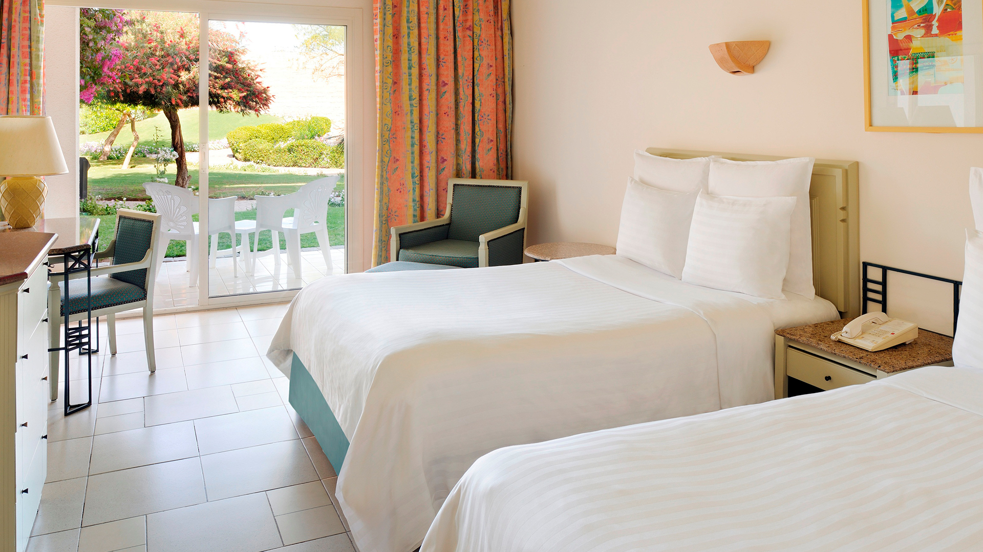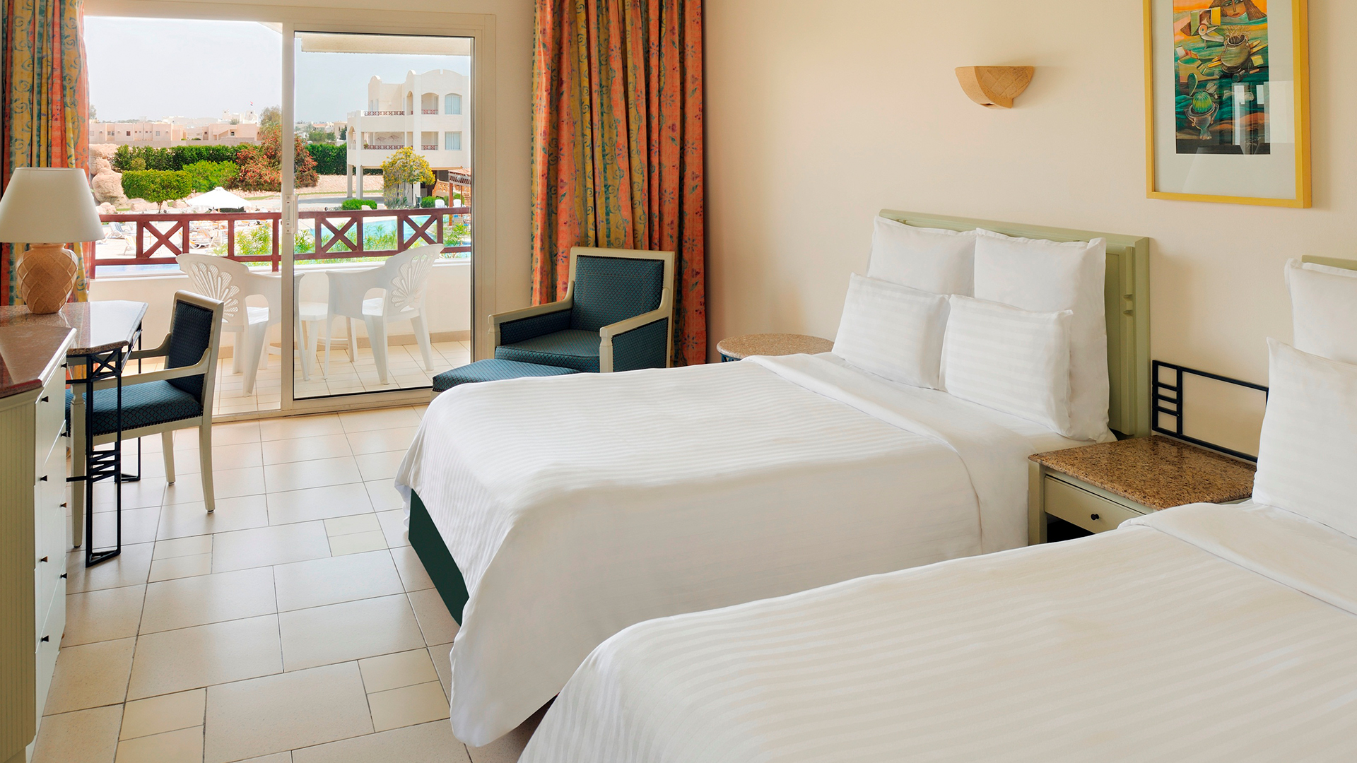 Med kingsize-seng eller to enkeltsenge. Haveudsigt, kan bestilles med pool- eller havudsigt