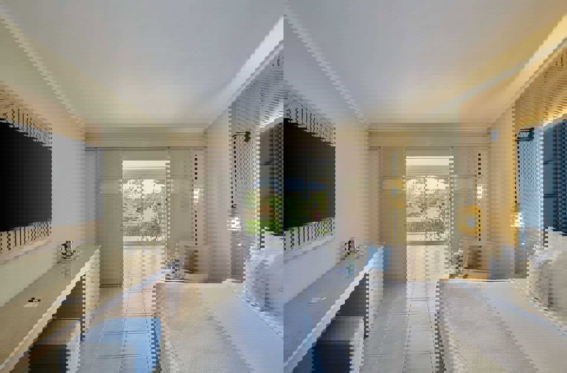 Stort værelse med dobbeltseng og skydedør til et værelse med to sovesofaer