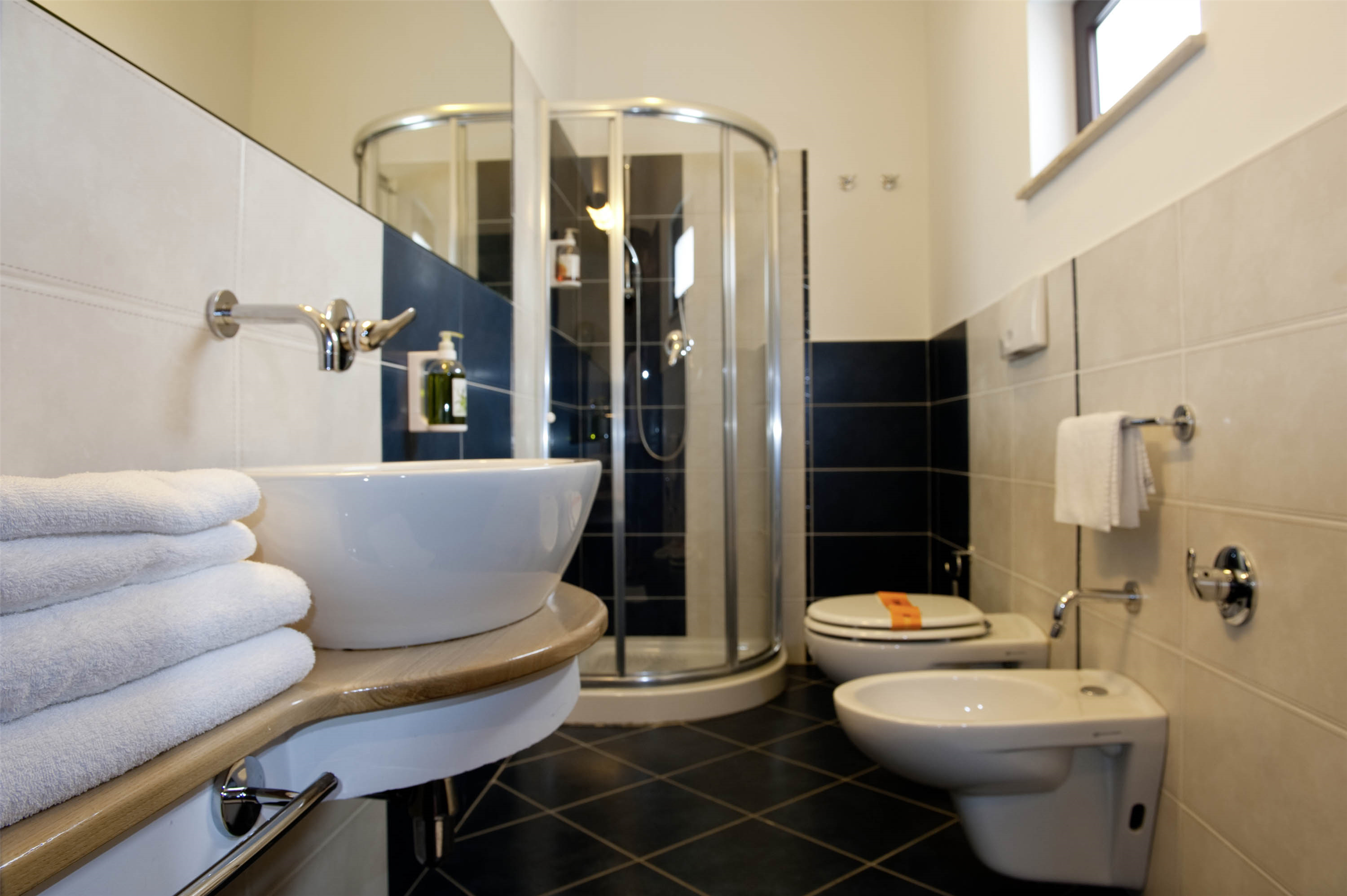 Badeværelse med brusekabine, håndvask og hårtørrer