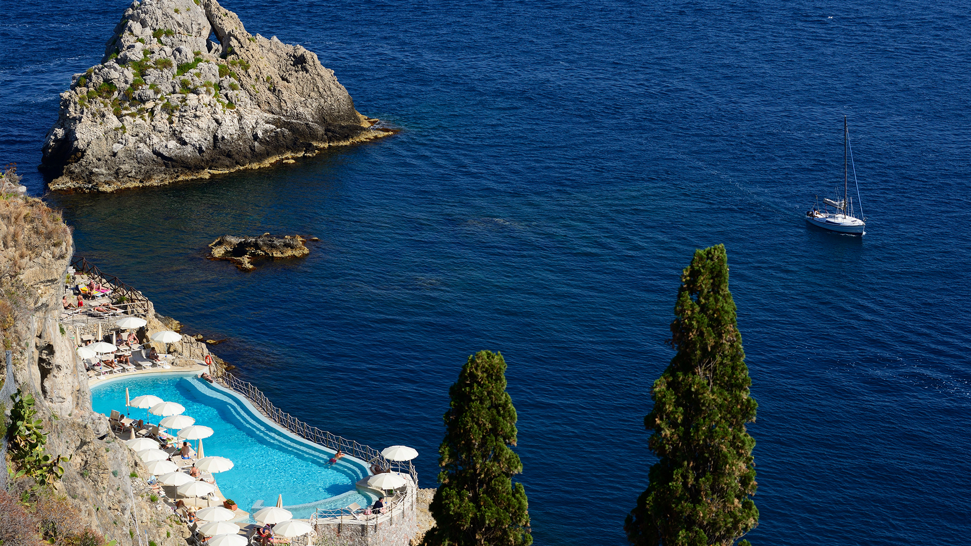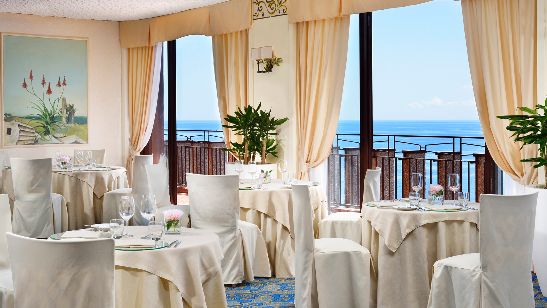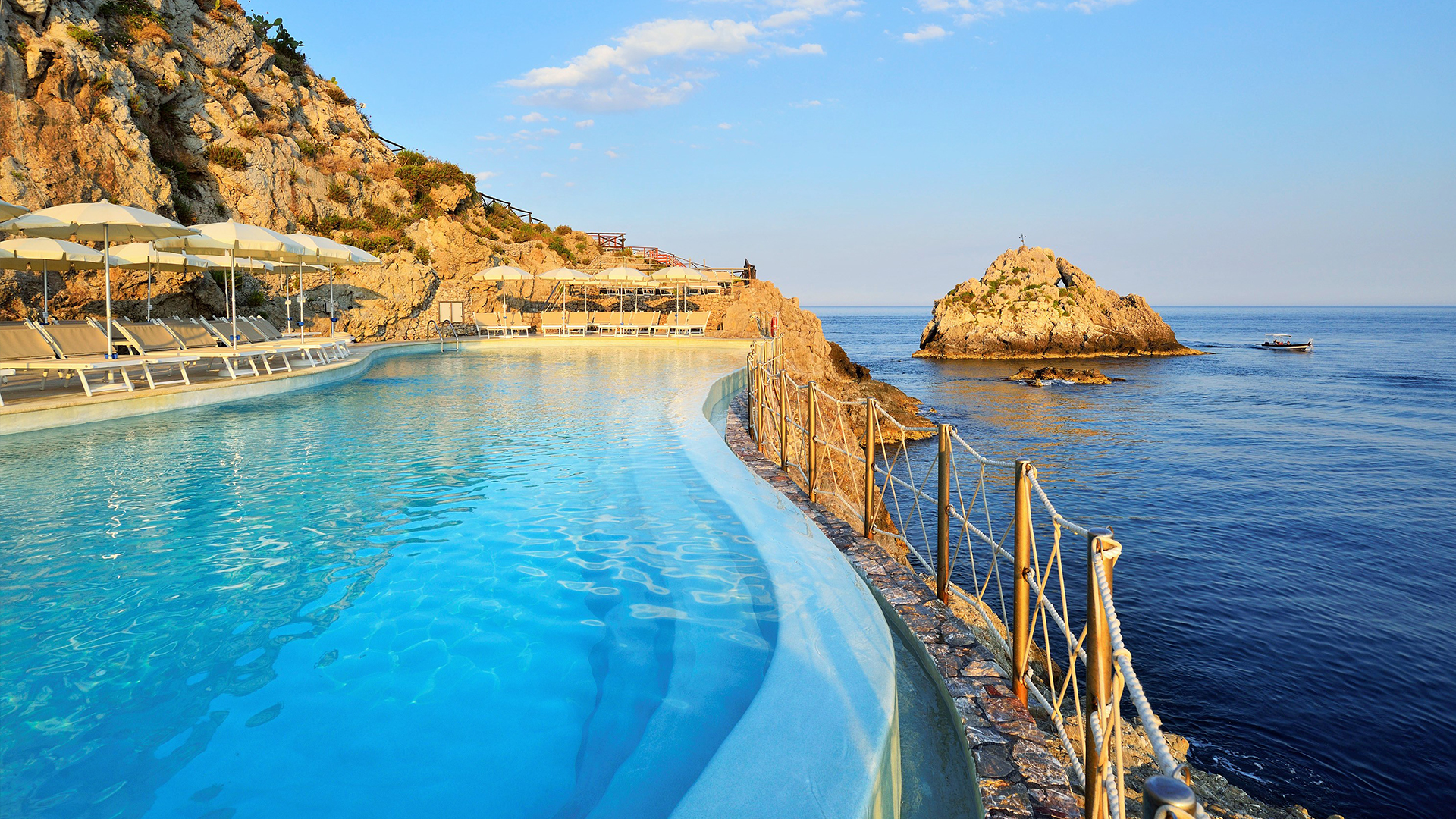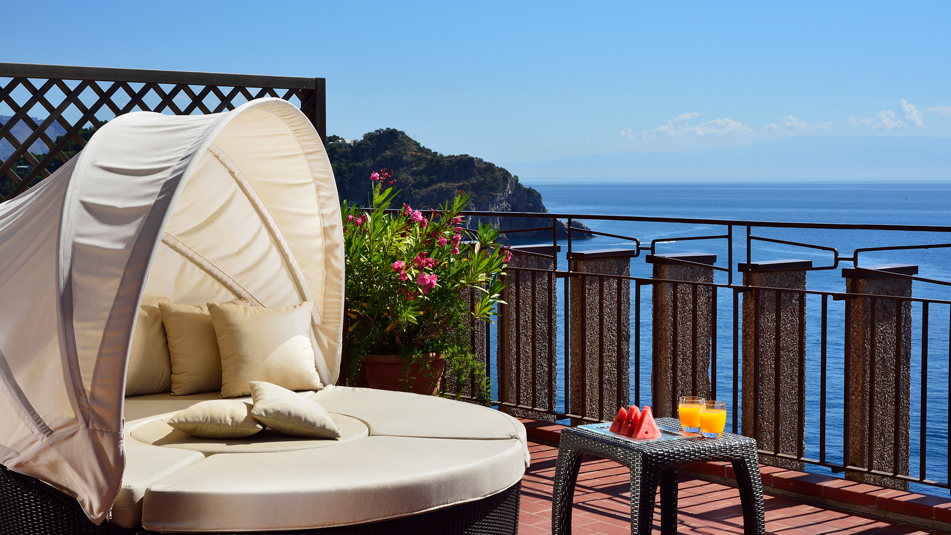 Hotel Capotaormina er et flot hotel med en god standard og afsides beliggenhed mod havet. Hotellet ligger i lommen af en klippe og du har direkte adgang til privat strand som du enkelt når via en svævebane.