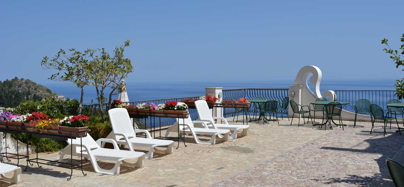 Fra toppen af hotellet er der hyggelige plateauer med borde og stole, hvor du kan se helt til vulkanen Etna - en fantastisk udsigt. Vello d’Oro tilbyder deres gæster på bustransport til stranden mod betaling, stranden ligger ca 3.5 km derfra, da man er placeret på bjergskråningen  ..