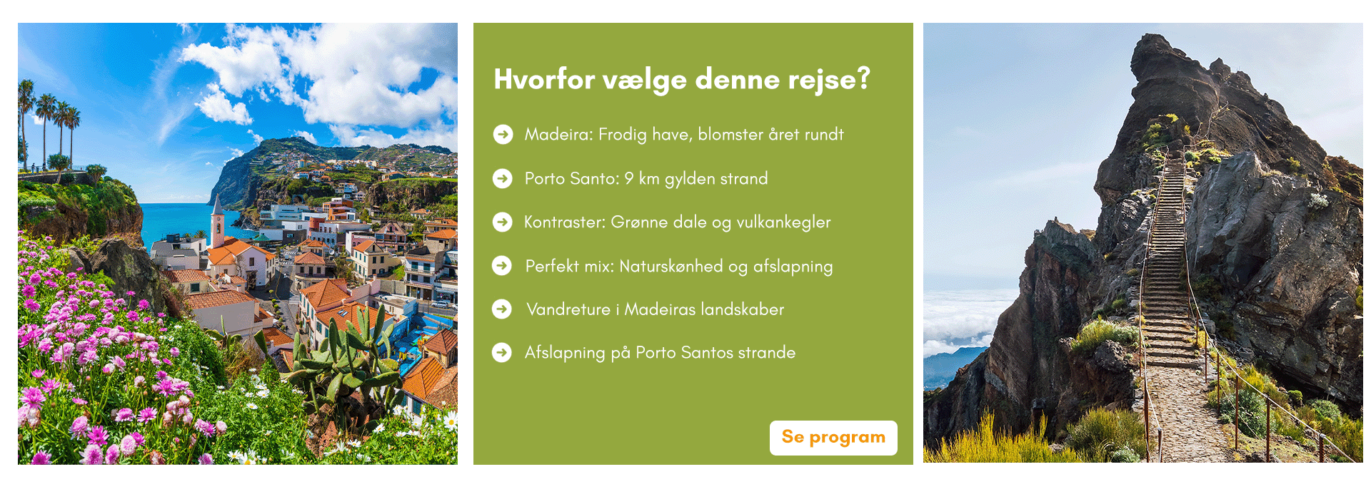 Oplev de storslåede landskaber på Madeira og Porto Santo med vores kombinerede vandreferie, specielt designet til danske rejsende. Denne rejse tilbyder en perfekt blanding af naturoplevelser, kultur og afslapning, hvor vi udforsker nogle af de mest betagende vandreruter i området.